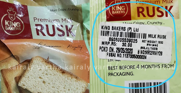അതിരമ്പുഴ അനുഗ്രഹയില് വെങ്കിടേശ്വരന്റെ മകള് സജിന വി കഴിഞ്ഞ 12ന് ഏറ്റുമാനൂര് പേരൂര് റോഡിലെ ന്യു ബസാര് എന്ന കടയില്നിന്നും വാങ്ങിയ 30 രൂപാ വിലയുള്ള പ്രീമിയം മില്ക്ക് റസ്കാണ് പരാതിക്കിടയാക്കിയത്. ചങ്ങനാശ്ശേരി മാടപ്പള്ളി കിംഗ് ബേക്കേഴ്സ് പ്രൈവറ്റ് ലിമിറ്റഡ് എന്ന സ്ഥാപനമാണ് നിര്മ്മാതാക്കള്. യഥാര്ത്ഥ ബാച്ച് നമ്പരും പാക്കിംഗ് തീയതിയും മറയ്ക്കുന്ന വിധം ബാര് കോഡോടുകൂടിയ പുതിയ സ്റ്റിക്കര് പതിച്ച നിലയിലായിരുന്നു ഉത്പന്നത്തിന്റെ കവര്. ഇങ്ങനെ പതിച്ചിരിക്കുന്ന സ്റ്റിക്കറിലാണ് പാക്കിംഗ് തീയതി 29/05/2020 എന്ന് രേഖപ്പെടുത്തിയിരിക്കുന്നത്.
